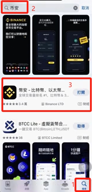 如果你和我一样用的是海外ID,那么软件内的文字会变成繁体字,可能有一点观看困难,所以请仔细的观看。我们点击右下角的放大镜图标,在上方输入“币安”进行搜索,第一个显示的是广告,我们选择下面的这个繁体字的币安选项,点击后面的下载安装,稍等一下就安装好了。
