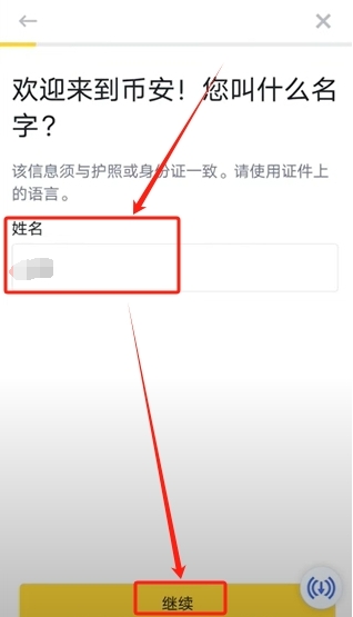 接下来要输入一个身份件名字,或者说你用护照注册,就使用护照上面的名字。这个一定要是真实的,是你真实证件上方的名字,胡乱写填写一个既通过不了认证,也是对你自己资产的不负责任,输入名字,点击下方的【继续】。