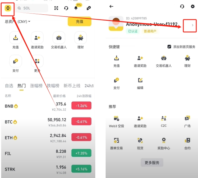 现在我已经登录上一个认证过身份的账号,我们要去身份认证的位置继续给大家进行讲解。点击左上角的币安小图标,点击自己的账户。