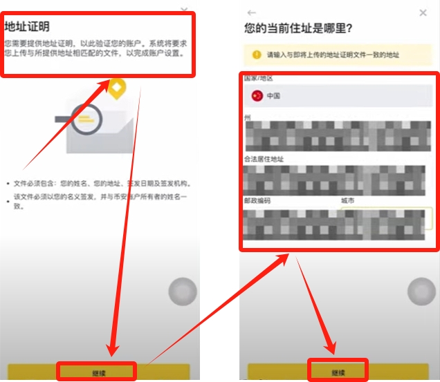 他需要提供地址证明、验证账户之类的。我们点击【继续】,看看他让我们填写什么,可以看到这里国内是灰色的,已经改好了。他还会让你选洲、地区、邮编、城市,我们填写一下地址,点击【继续】。