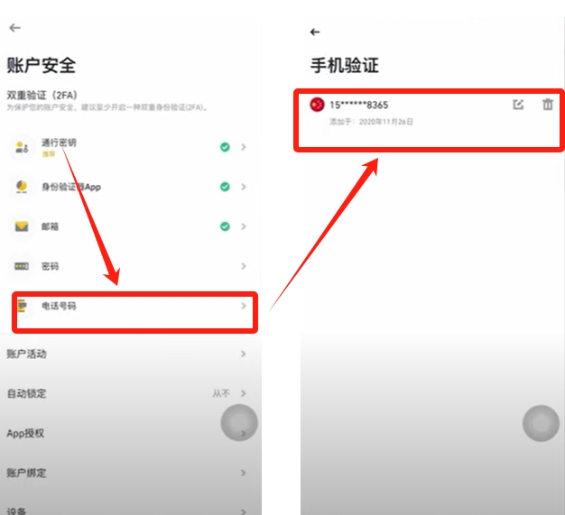 可以看到我前三个后面已经有绿色的对钩了。密码和电话号码在我们注册的时候,其实也都填写过了,绑定过了。但是不知道为什么这个后面没有对钩。我们点击“电话号码”进去看,可以看到我们是有电话号码的。