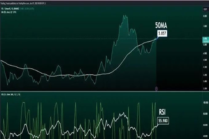 50日移动平均线(5.857美元)显示看涨趋势,RSI(55.98)处于中性区间,RVOL表明当前成交量疲弱。