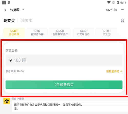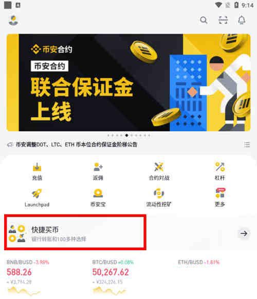 4、通过首页"快捷买币"功能购入USDT,这是平台内与美元挂钩的通用代币。