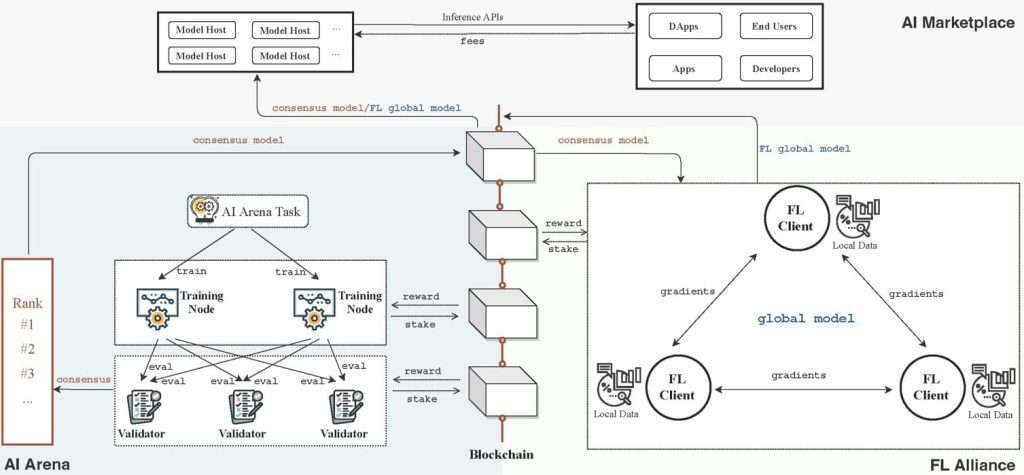 平台采用三模块架构:AI竞技场负责模型训练验证、联邦联盟进行本地数据微调、AI市场实现应用部署。这种设计有效解决了传统AI开发中的数据垄断问题,确保模型训练过程的透明性。