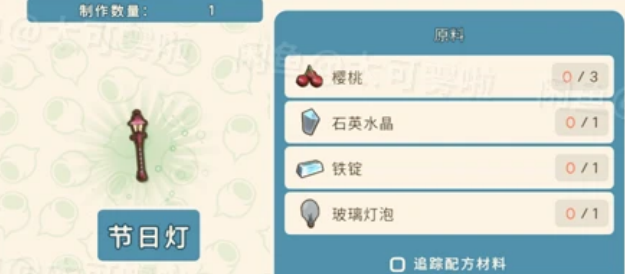 樱桃*3、石英水晶*1、铁锭*1、玻璃灯泡*1