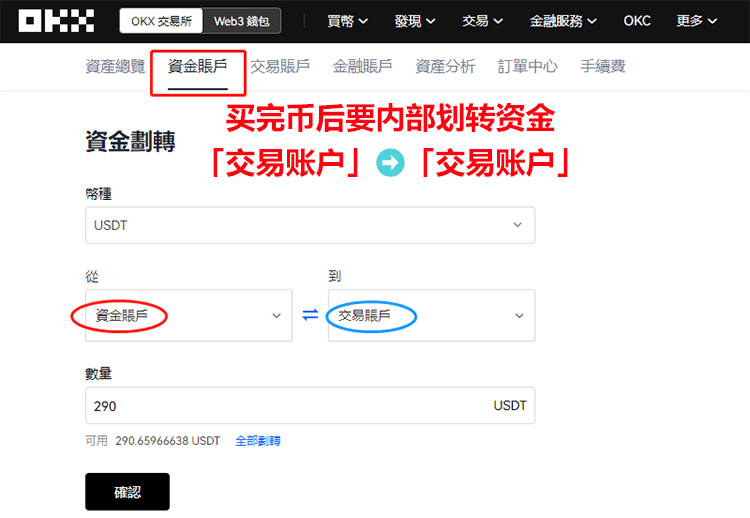 购得USDT后需手动从资金账户划转至交易账户才能进行币币交易。站内转账零手续费,操作路径:资产页面→资金划转→选择币种和数量。