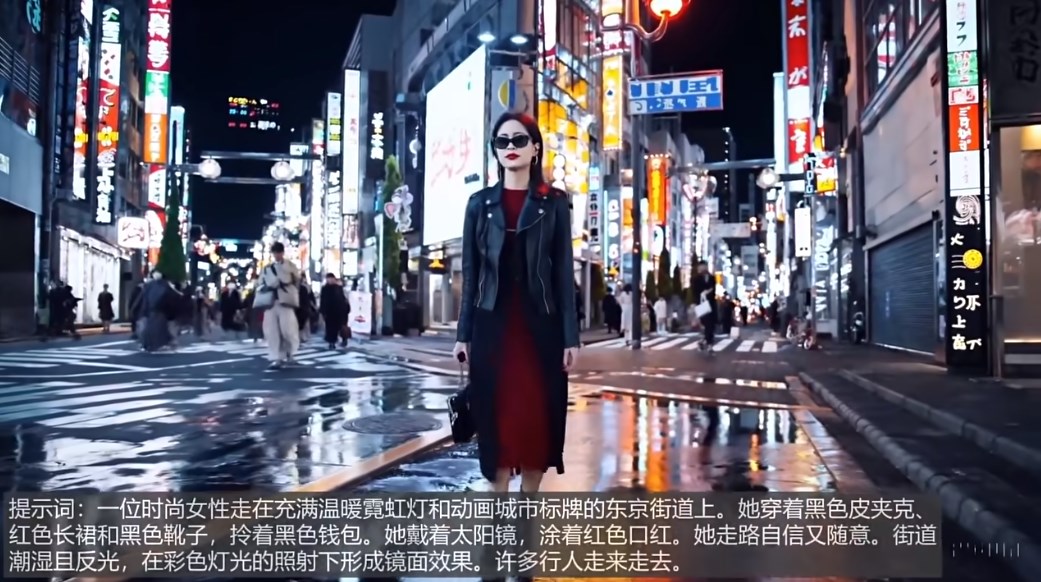 输入文本:东京街头一位时尚女性漫步在霓虹闪烁的街道。她身着黑色皮衣与红色长裙,搭配黑色短靴和手提包,戴着墨镜涂抹红唇。湿润的路面反射着斑斓灯光,周围行人川流不息。