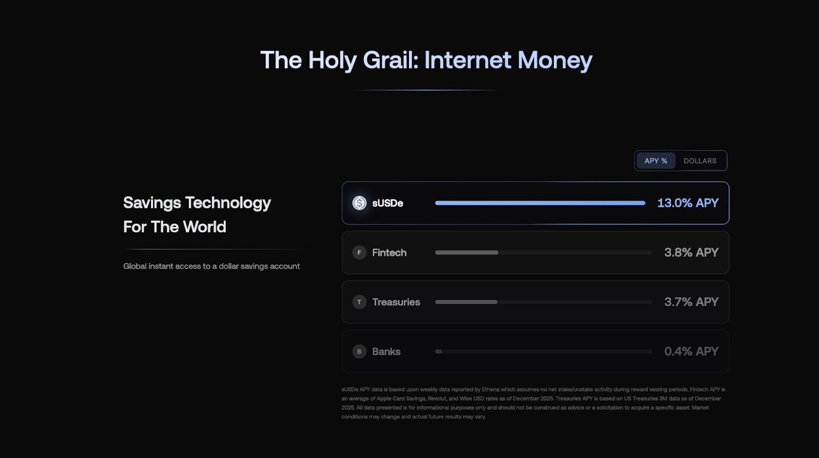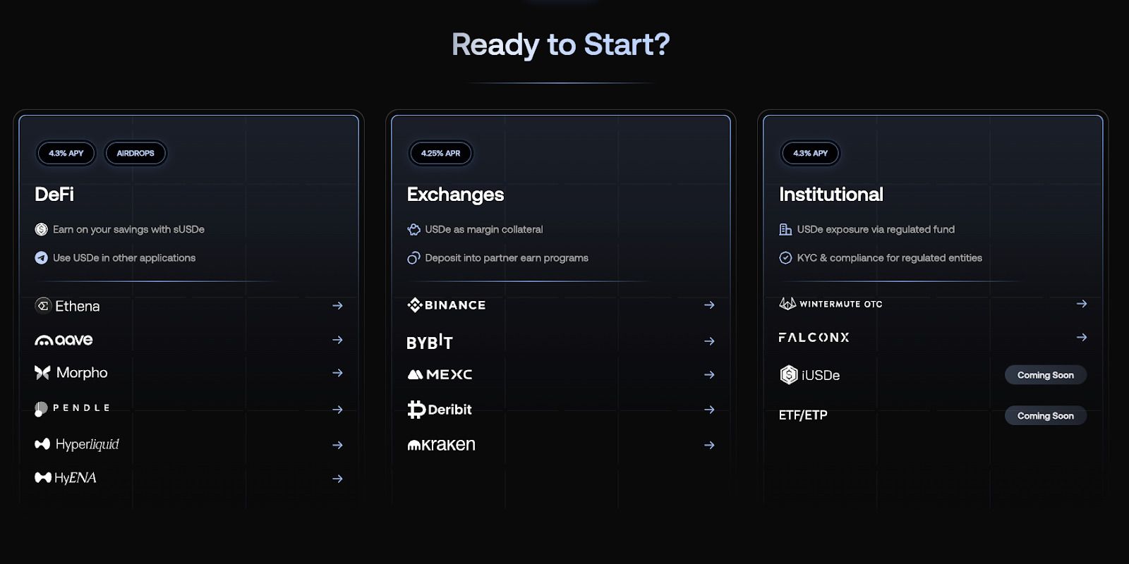 Ethena构建于以太坊网络,通过智能合约和衍生品组合发行USDe稳定币。其核心技术采用Delta对冲机制,使用ETH、BTC等加密资产作为质押,同时在衍生品市场建立空头仓位,确保美元价格稳定。用户可通过质押支持资产铸造USDe,而sUSDe则通过衍生品资金和质押奖励产生收益,被定位为"互联网债券"。