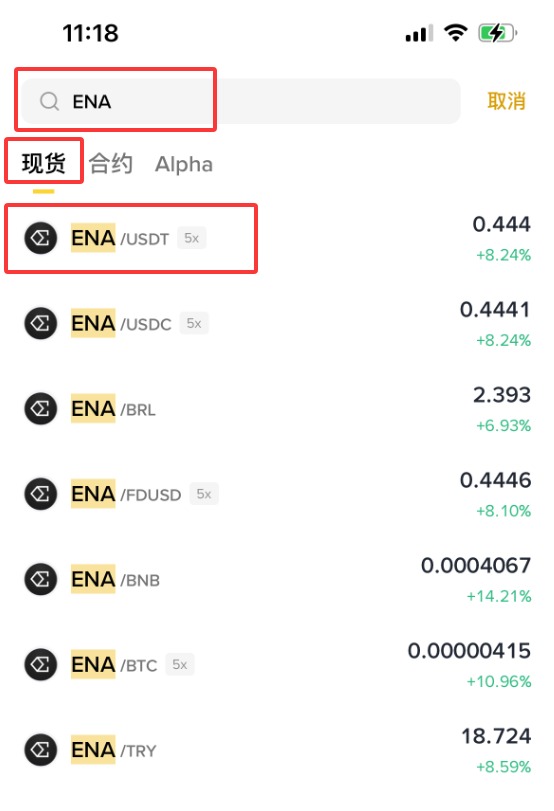 3. 在搜索框输入ENA,选择显示的【现货】-【ENA/USDT】交易对(新手建议避开合约交易)