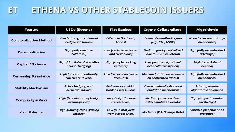 USDe通过链上对冲机制,在透明度、收益性和去中心化程度方面显著优于USDT/USDC等发比稳定币,同时避免了算法稳定币的崩盘风险。