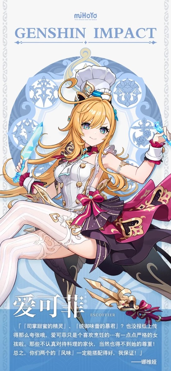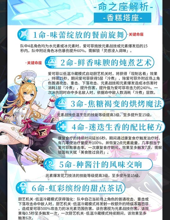 队中4名角色均为水元素或冰元素时,爱可菲施放元素战技或元素爆发后的15秒内,队中附近角色冰伤暴伤提升60%。需解锁「灵感浸入调味」。