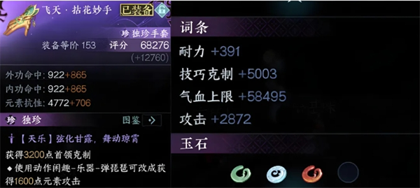 1、【飞天·拈花妙手】:基础词条是技巧克制,独珍效果可切换为3200点首领克制或者1600点元素攻击。