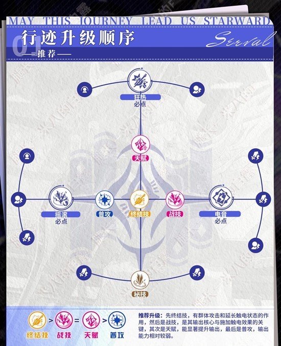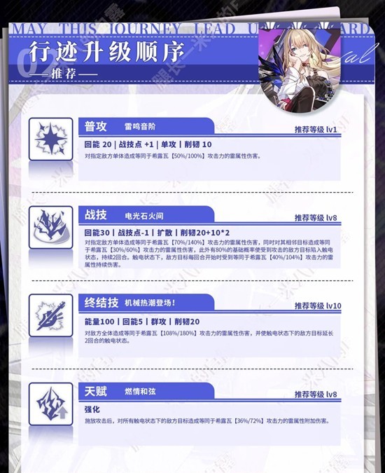 推荐升级:先终结技,有群体攻击和延长触电状态的作用,然后是战技,是其输出核心与施加触电效果的关键,其次是天赋,能显著提升输出,最后是普攻,输出能力相对较弱。