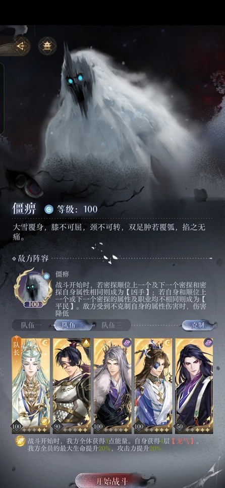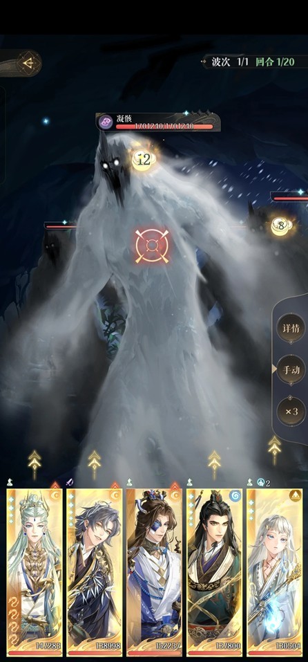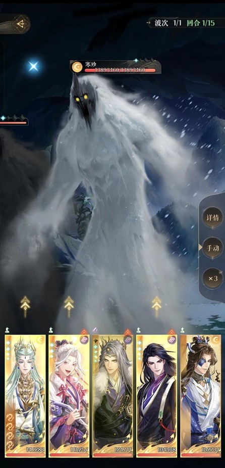 寒殓:普攻左边回能,下拉右边抢能,左边开大增技伤两回合,第一个行动的下一个回合无法行动,必须先打右边或同时击杀。两个怪大约有1900w血量,关卡buff给了少量攻击力但全队只有一个人可以打出伤害,数值不太对劲。推荐队伍:二星张绣、一星完美盘张绣、dot队、dot+辽统。