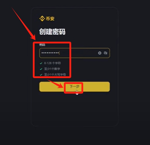 接下来他会让你创建一个密码,这里要求8-128个字符、至少需要一个数字、至少需要一个大写字母。你就按照这个要求输入8个以上就可以了。你的密码如果完成了这三个要求,前面都会打勾,如果你缺少一个大写字母,这里就会显示没有完成。然后点击【下一步】。