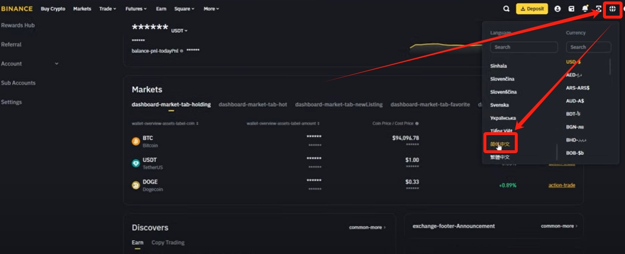 当你注册好了,也认证成功了,就可以进行c2c买币卖币了。进入到币安的页面,很多新手朋友进来之后可能页面显示的是英文,比如可以去调整一下他的语言。点击右上角的地球图标,往下拉,点击“简体中文”,就帮我切换成了中文的界面。