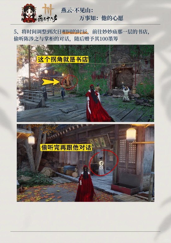 5、将时间调整到次日相同的时辰,前往妙妙庙那一层的书店,偷听陈涉之与掌柜的对话,随后赠予其100墨筹