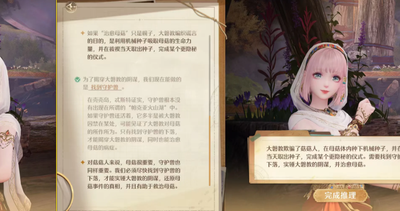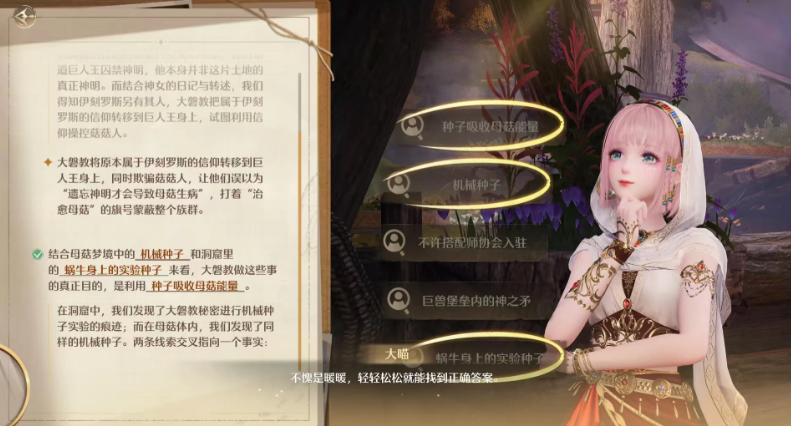 无限暖暖伊赞之土2.0中第三章任务,共有三轮需要根据题目以及线索来推理答案。第一轮的答案是伊刻罗斯、巨人王;第二轮的答案是机械种子、蜗牛身上的实验种子、种子吸收母菇能量;第三轮的答案是找到守护兽。