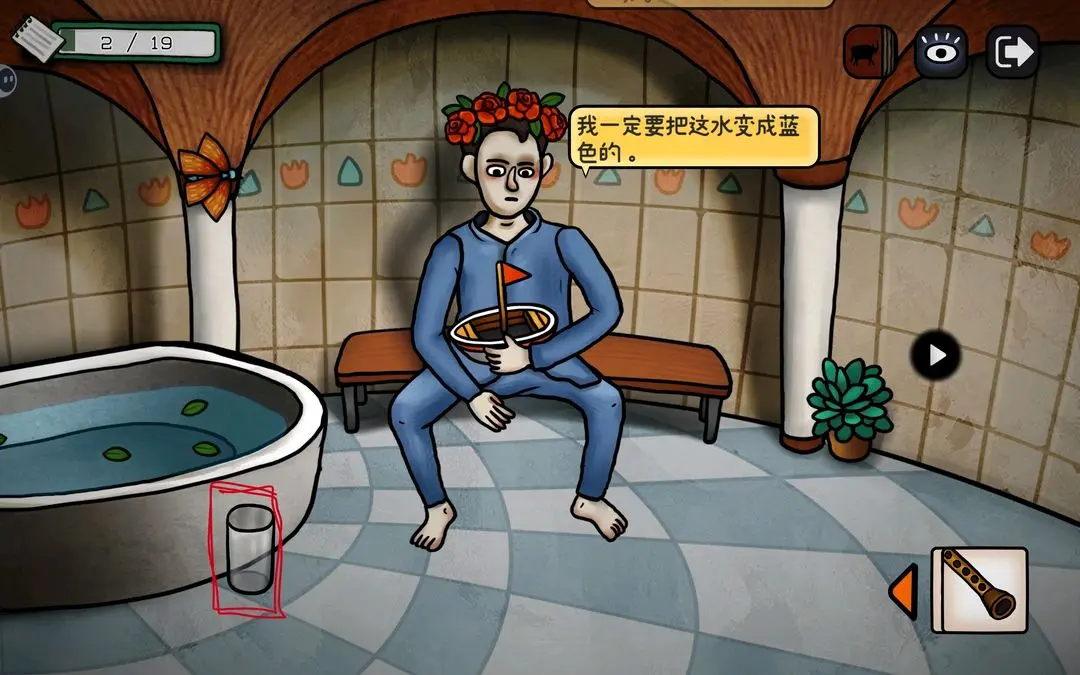 10、进浴室,拿走玻璃杯,和花环男对话,得知要把浴缸变蓝