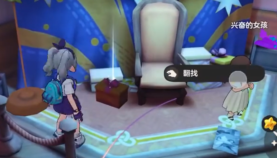通过这一关之后要注意一个很重要的收集点,就是在地图上有椅子的位置。那个地方可以点击翻找,会获得眠枭之星这个道具。这个道具在后面的游戏进程中有用,所以千万不能漏掉。拿到道具之后继续往地图深处走,会遇到一位富有的夫人。和她对话完成互动,然后根据任务提示去操作吧台的桌子,把桌子挪动一下。接着又要去找另一位叫发愁的夫人,和她对话之后继续按照指引做下去。