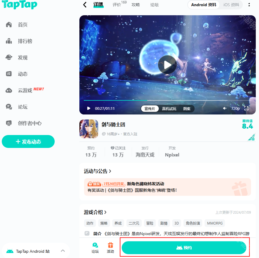 4、TapTap直接在游戏详情页面点击下方【预约】按钮即可