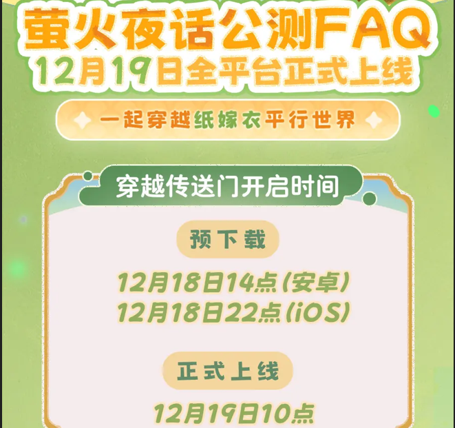 《萤火夜话》于12月19日早上10:00正式开启公测!(12月18日)预下载先行启动。纸嫁衣平行世界的冒险即将启程,期待之余,你是否也感到一丝紧张?为帮助各位访客顺利启航,我们特别准备了这份公测FAQ指南,涵盖从下载到问题的各类解答,助你无忧探索。