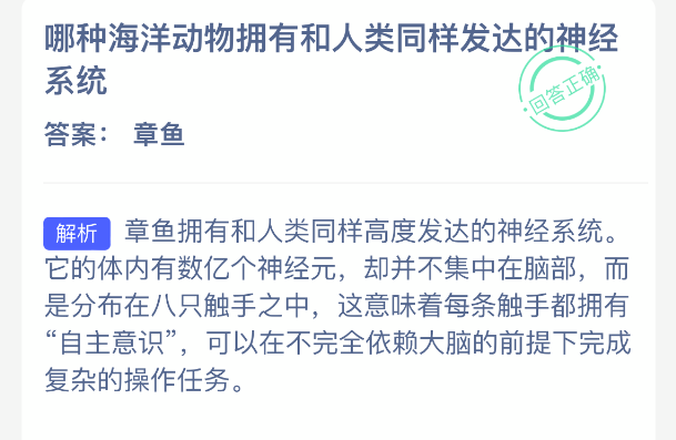 以上就是哪种海洋动物拥有和人类同样发达的神经系统?神奇海洋今天答案最新2025年12月19日分享,更多相关攻略内容,请点击关注本站手游网更新!