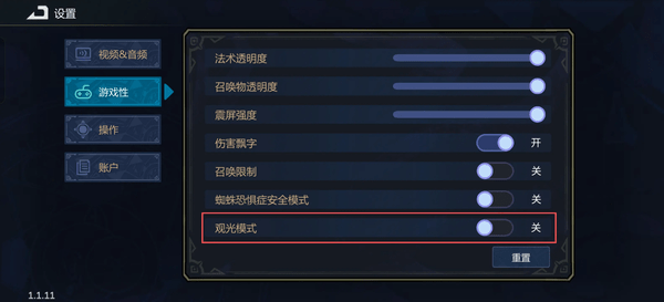 在游戏中首个关卡中累计死亡次数达到2次后可以在设置界面开启观光模式