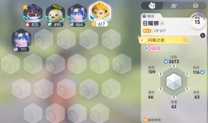 推荐采用“远程压制+渐进逼近”策略完成收服:优先培养1–2只具备稳定远程输出能力的初始宠物(如风系或光系远程单位),在安全距离持续施压,待日耀狮生命值降至约40%–50%区间时,再切换主力宠物进行最终捕捉。该角色基础面板均衡,生命值成长突出,物理与魔法双攻数值均处于同阶前列,适合作为队伍前排承伤核心或半肉输出位进行定位发展。后续培养中,建议优先解锁并升级【光耀步距】与【迅爪连击】两类技能,逐步拓展有效攻击范围,实现由纯近战向中距压制型打法的战术转型。
