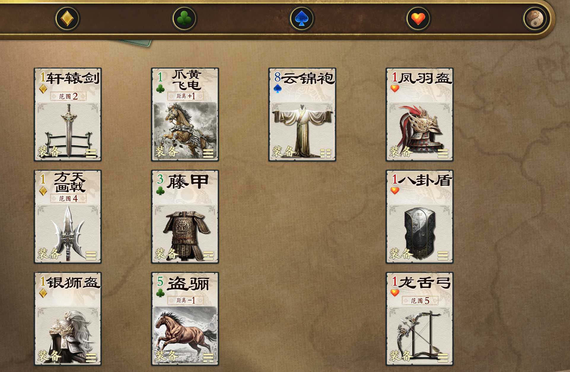 游戏内卡牌分为三大基础类别:行动牌、战法牌与装备牌。行动牌用于执行基础操作,包括“杀”(造成1点伤害)、“闪”(抵消1次杀)、“桃”(回复1点体力)、“怒”(特定条件下触发额外效果)及“易”(改变牌序或目标);战法牌对应武将专属技能,需满足对应条件方可激活;装备牌则提供永久性属性加成或特殊效果,需通过“装备”动作置入对应栏位后生效。