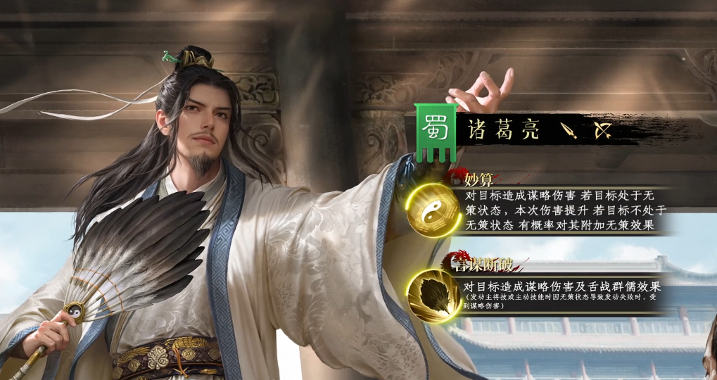 诸葛亮是策略系输出与干扰控制的代表角色。其技能免疫部分敌方干扰效果,确保自身输出稳定性;对敌方造成谋略伤害时,若目标处于“无策”状态,则伤害提升50%。其技能有50%概率为命中目标附加“舌战群儒”效果,使目标在6秒内每次发动主将技时,额外承受一次谋略伤害。整体呈现“以攻代守、反制优先”的战术风格。