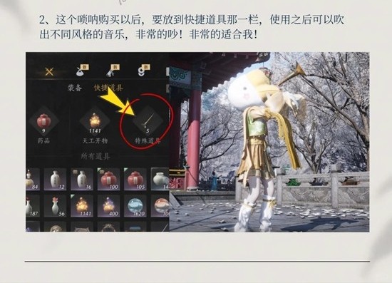 2、这个唢呐购买以后,要放到快捷道具那一栏,使用之后可以吹出不同风格的音乐,非常的吵!非常的适合我!