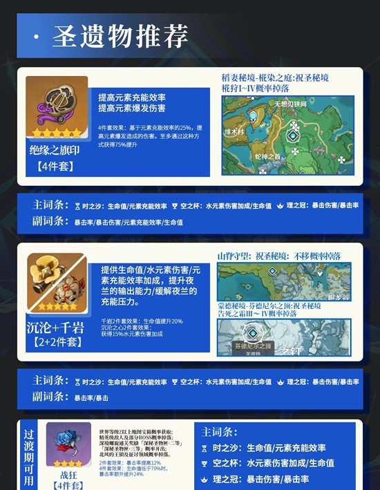 圣遗物推荐:①绝缘4,②沉沦2+千岩2,③战狂(过渡)