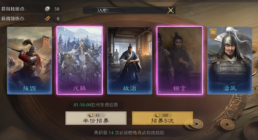 本作采用低门槛保底设计:每累计抽取20次,必定获得一名橙色品质武将——该品质为当前游戏内最高稀有度。实际体验中,多数玩家在第10至20抽区间即可触发保底,显著降低前期获取核心战力的不确定性。值得注意的是,《九牧之野》并未将武将与技能卡池独立设置,而是实行双轨融合机制:同一卡池中既可抽取橙色武将,也可获得各类主动/被动技能卡。这一设定大幅提升了单次抽取的综合收益,使玩家在构建阵容的同时,同步积累关键能力组件。