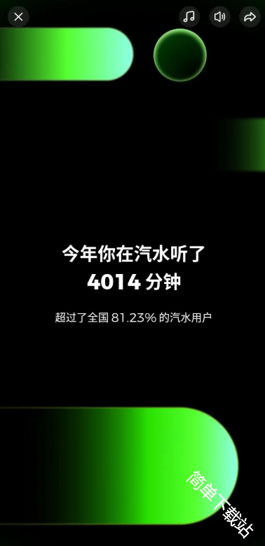 打开汽水音乐后,点击弹窗、挂件、banner等位置即可进入活动开启,可以看到总结的在汽水音乐中听歌的时长和年度最爱歌曲等相关信息内容,还会有最爱歌手等。