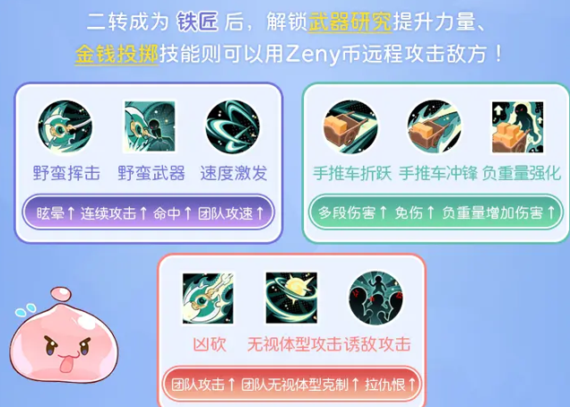 2、二转成为铁匠后,解锁武器研究提升力量、金钱投掷技能则可以用Zeny币远程攻击敌方!