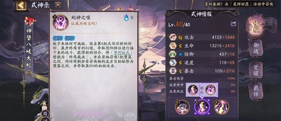 二技能:施放,进入蛇神状态,将所有友方式神的初始攻击的6%封印在天羽羽斩中,蛇神状态被击败,提升自身100点速度。
