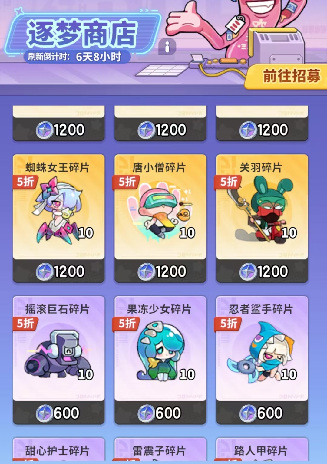 在逐梦商店中,招募积分可用于兑换传说、史诗及稀有品质的梦灵。不同品质梦灵所需积分不同:传说梦灵享受限时五折优惠时,单次兑换10碎片仅需1200积分;每位梦灵的前三次兑换均适用该折扣,后续兑换恢复全价,即2400积分/10碎片。因此,若想一次性合成完整梦灵(需70碎片),最低需消耗8400积分。值得注意的是,每位梦灵的五折权益每周重置一次,玩家可采用分周策略——每周仅兑换三次,待下周折扣刷新后再继续,如此总计仅需6000积分即可集齐一位传说梦灵。