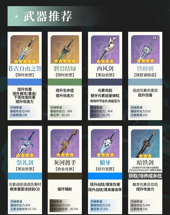 武器: 苍古,磐岩结绿,西风剑,铁蜂刺(锻造),祭礼剑,灰河渡手,狼牙(纪行),暗铁剑