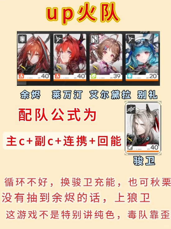 up火队循环不好,换骏卫充能,也可秋栗没有抽到余烬的话,上狼卫这游戏不是特别讲纯色,毒队靠歪