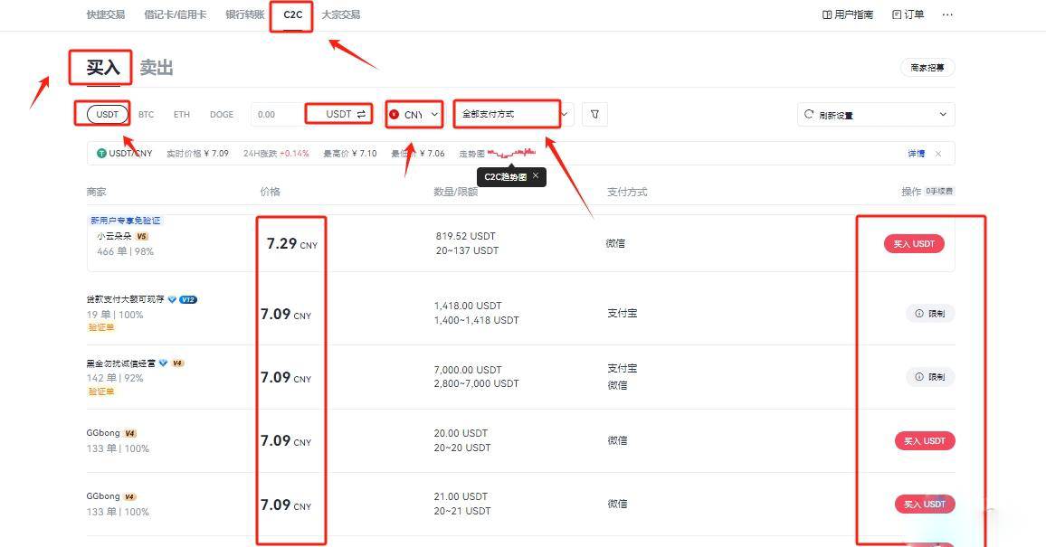 4. 在导航栏选择"买币"-"法定货币交易",通过C2C渠道购买USDT作为交易媒介