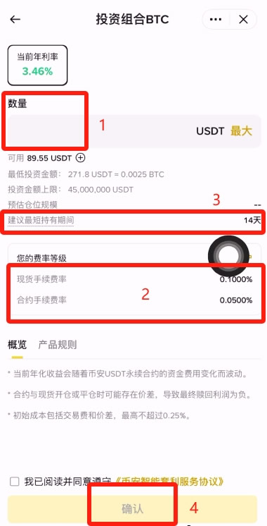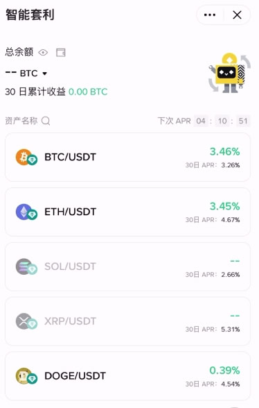 进入币安理财的「智能套利」页面选择想要投资的币种和金额确认设定并启动套利