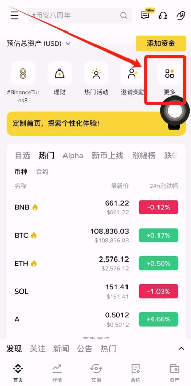 1、注册完成之后,打开币安APP的首页,点击这里的【更多】。