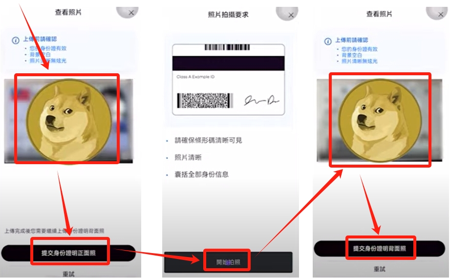 然后开始拍照。因为在KYC的时候,我发现有些手机可能会拍得不清楚。如果你这层验证实在是过不了审核,但你又想过,你可以直接跟他们的客服反映一下。点击“提交身份件明正面照”,点击“开始拍照”拍摄反面照片,点击“提交身份件明背面照”。