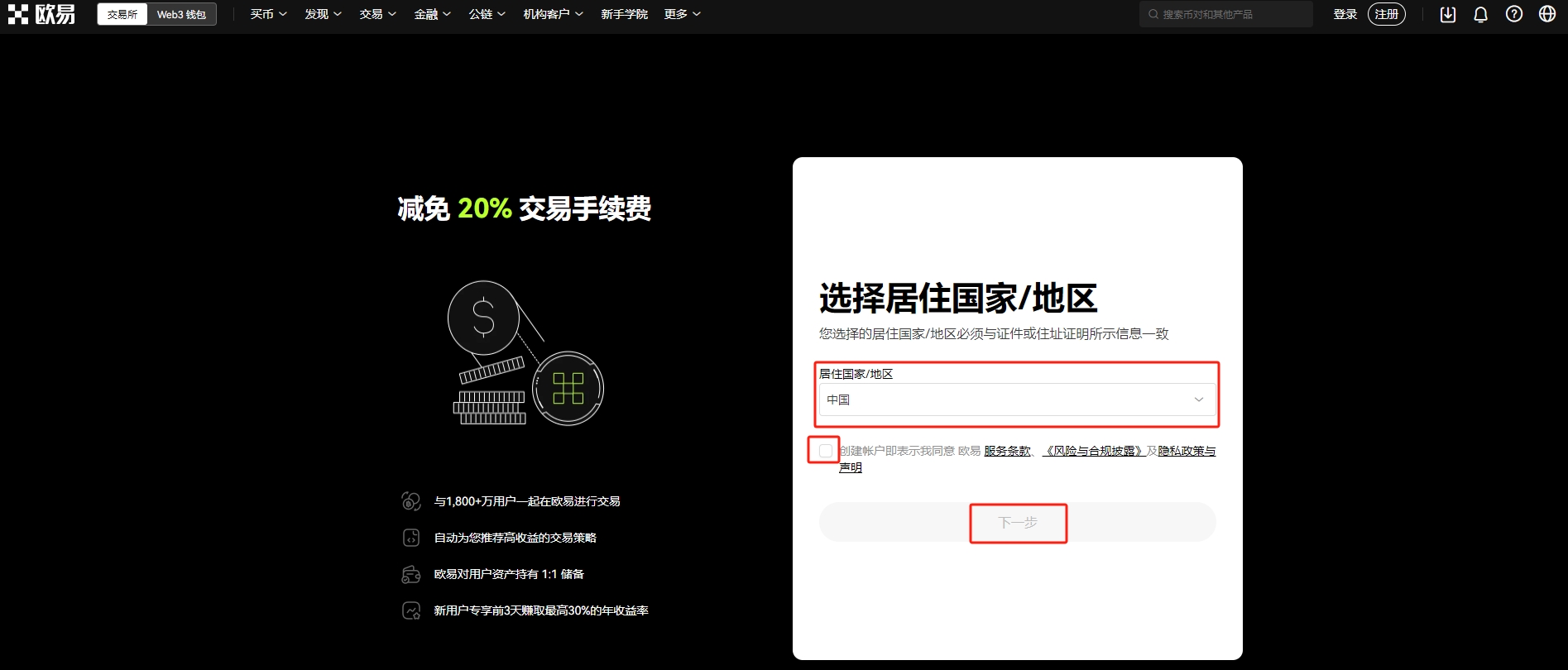居住地/地区选择“中国”,勾选同意服务条款,点击【下一步】。