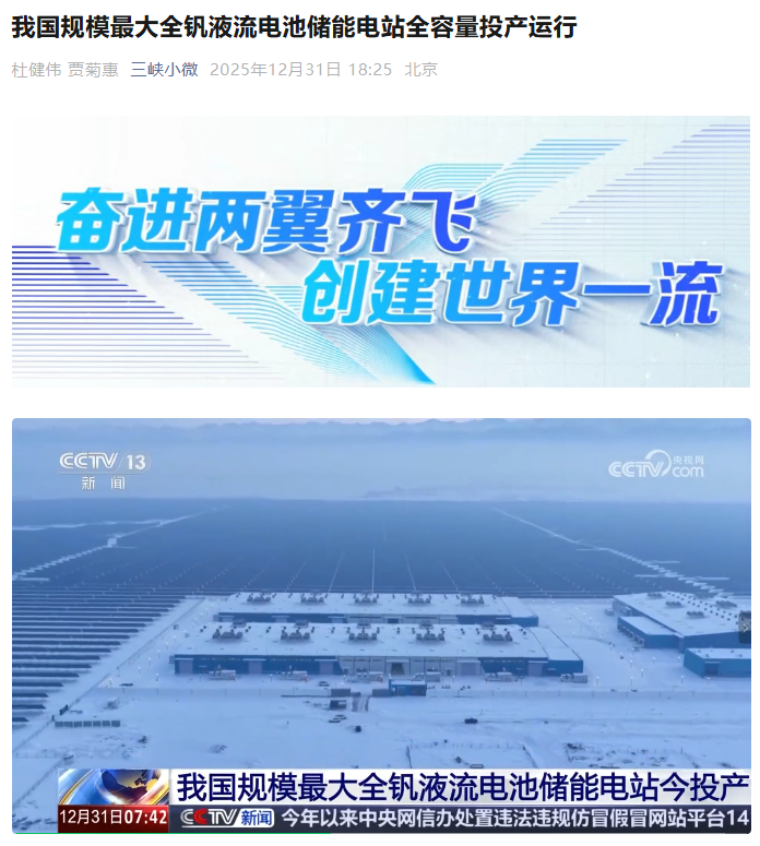 1 月 3 日消息,据三峡集团官方,12 月 31 日,我国规模最大全钒液流电池储能电站 —— 三峡集团新疆吉木萨尔全钒液流储能电站实现全容量投产运行,标志着我国在大容量、长时储能技术应用领域实现重要突破。