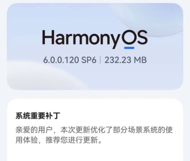 注意到,昨日已经有部分机型收到了鸿蒙 6.0.0.120 SP6 更新,主要内容为优化了系统使用体验。