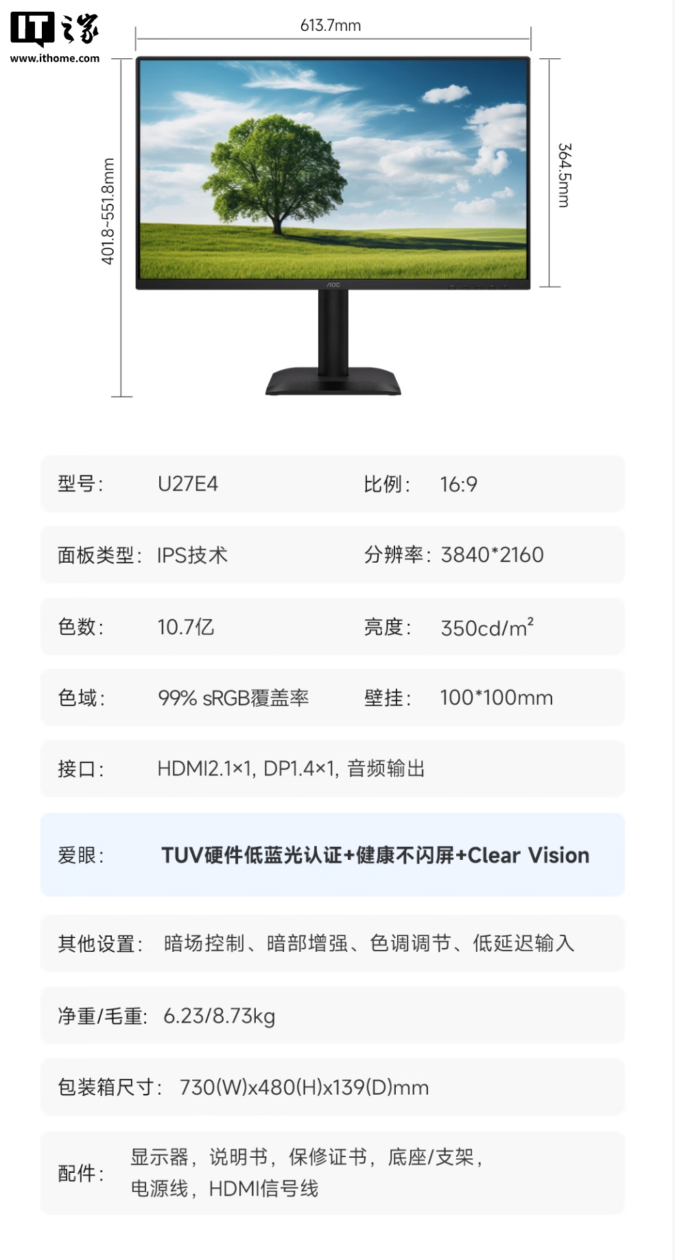 AOC 推出 27 英寸显示器 U27E4:4K 60Hz、支架支持重力感应,1399 元