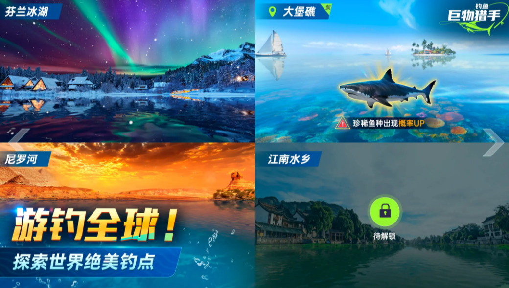 本作取消传统体力限制,支持全天候自由垂钓。全图覆盖超百个地理特征鲜明的钓场,涵盖近岸礁盘、远洋海沟及极地冰层等多样化环境,可收集鱼类逾三百种。多人同服竞技模块同步开放,通过实时比拼刷新个人纪录,赢取专属外观与强化配件,持续拓展全球海域探索版图。