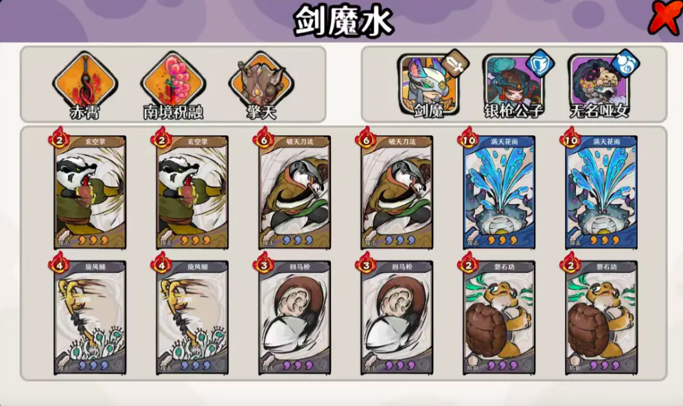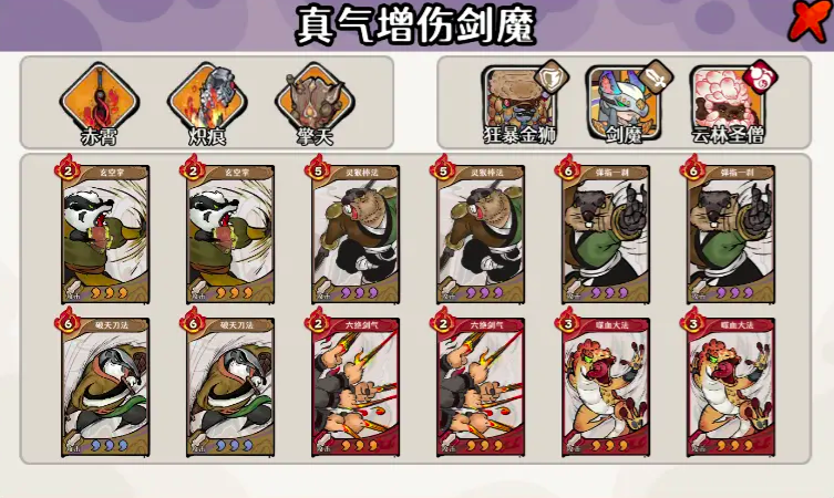 【真气爆发型·增伤专精流】 本套侧重极限输出压制,对角色培养深度要求较高。神兵仍以擎天为基石,赤霄与赤痕构成双赤组合,强化真气转化效率。武侠配置中,将玉兔替换为云林圣僧,但须满足其命格条件——必须达成2命方可激活完整增伤链。卡组沿用剑魔专属的8张基础卡池,并额外补充4张以灼烧效果为核心的攻击型卡牌,实现持续真气叠加与伤害溢出。